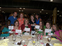 We had 10 at our dinner table. There are 5 of us who have traveled together in the past so we were interviewing 5 fun folks with whom to break bread. Jennifer, Julie, Clint, Candace, and Brittany made the final cut. This is us holding up the recipes for the snazziest dessert ever – chocolate melting cake.
